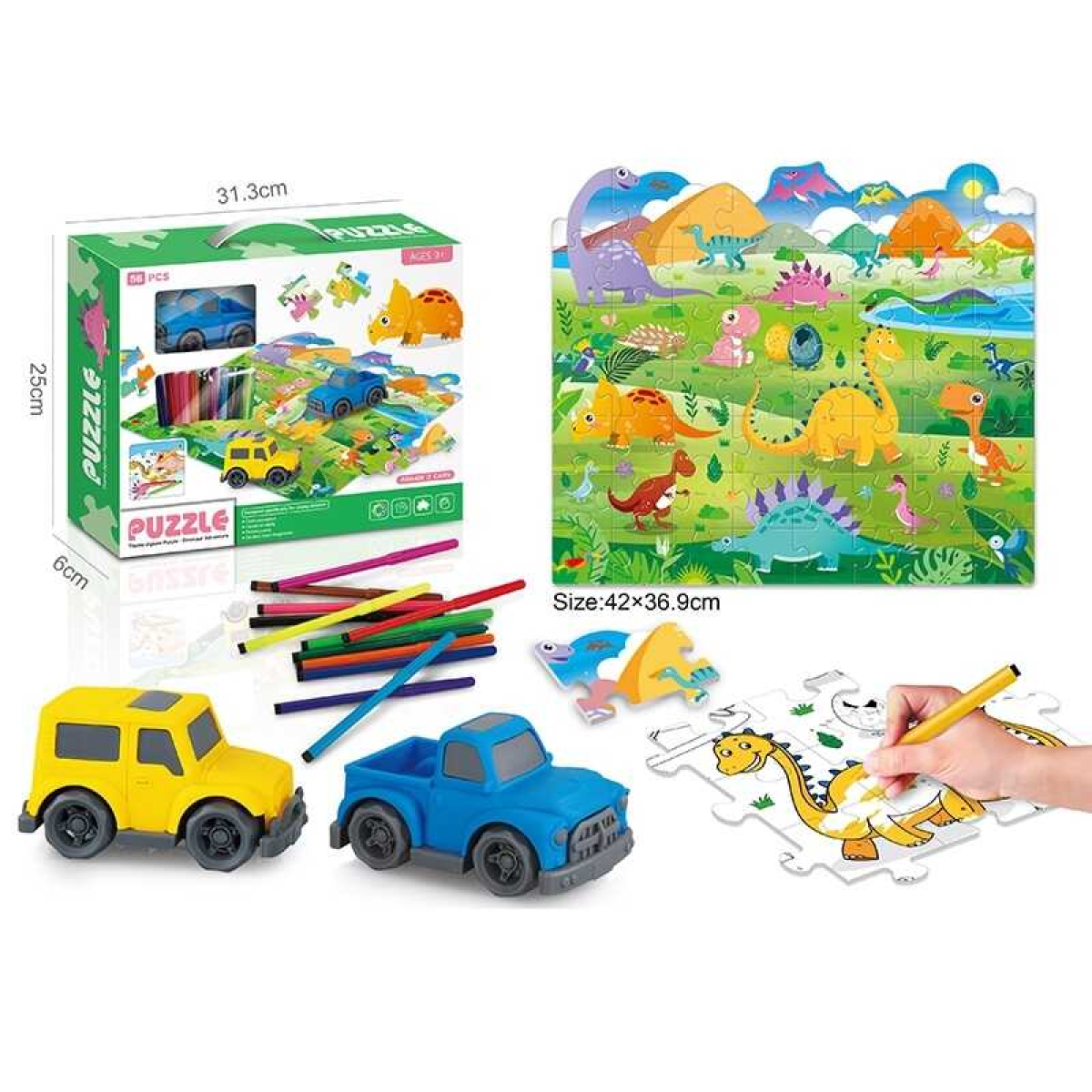 Двосторонній пазл 7077-103 (48/2) “Динозаври”, 56 елементів, фломастери 12 кольорів, розфарбовка, машинка, пазл 42х37 см, в коробці