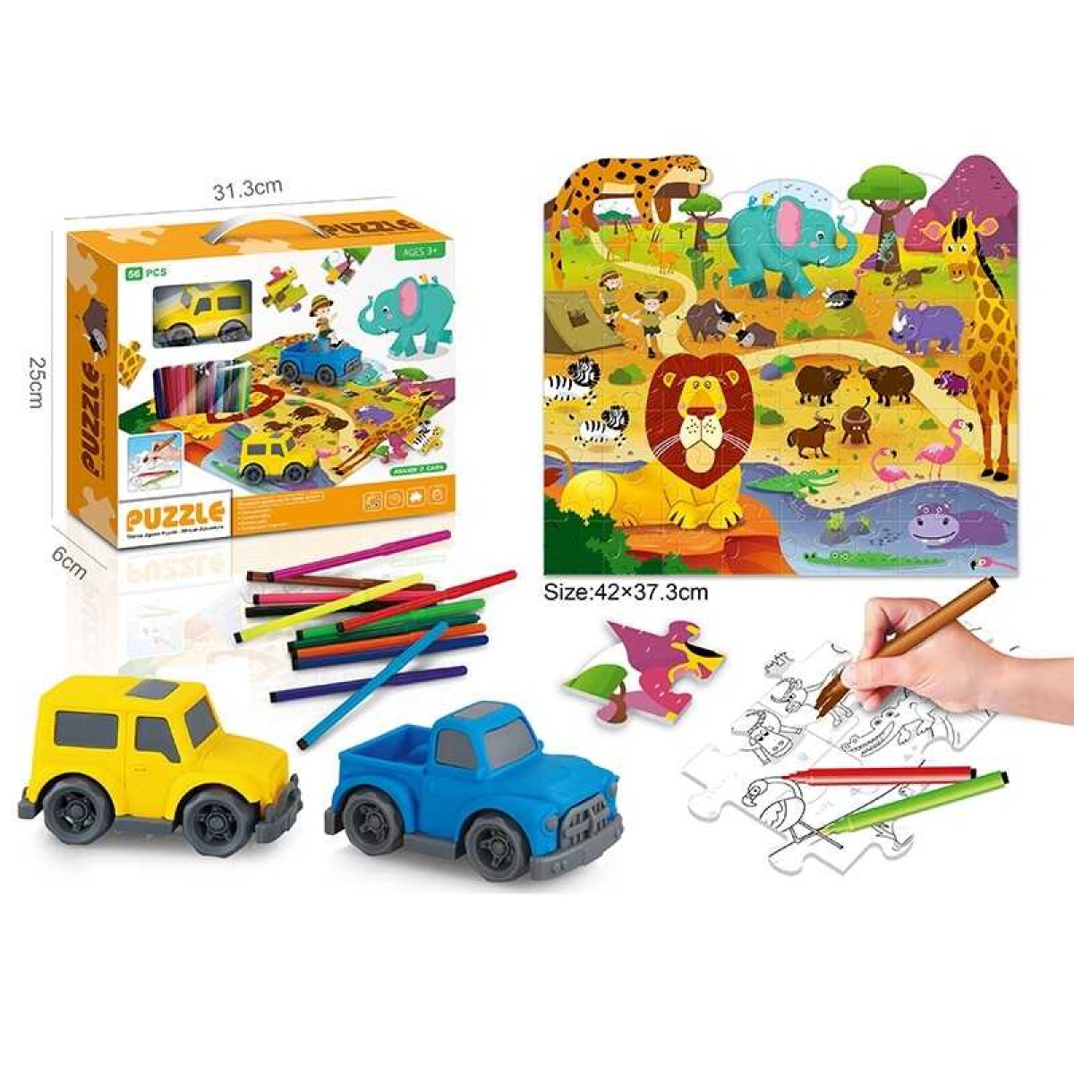 Двосторонній пазл 7077-105 (48/2) “Сафарі”, 56 елементів, фломастери 12 кольорів, розфарбовка, машинка, пазл 42х37 см, в коробці