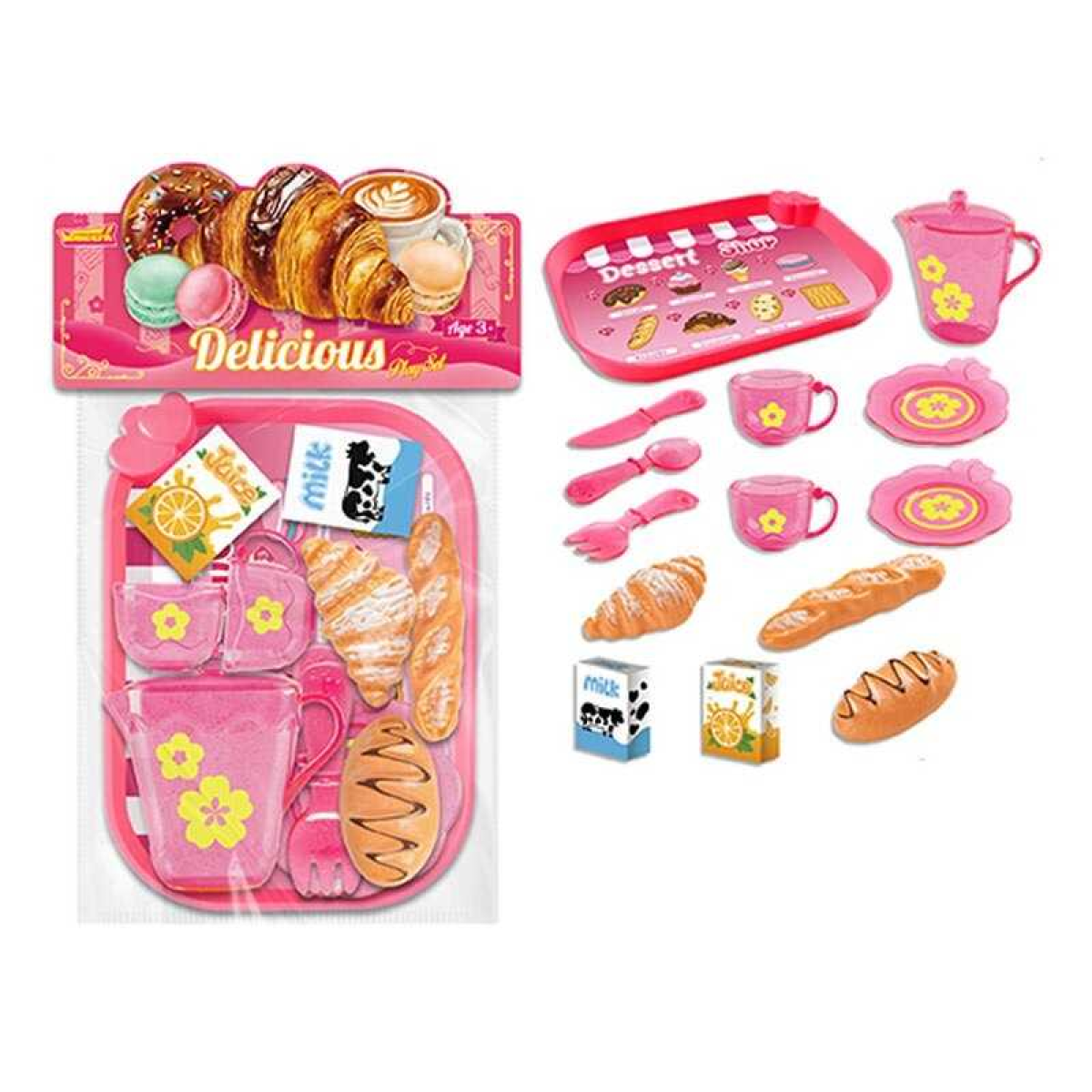 Набір продуктів 99007 (120/2) таця, 2 чашки, 2 блюдця, чайничок, ніж, ложка, вилка, круасан, багет, хліб, коробочки з молоком і соком, в пакеті