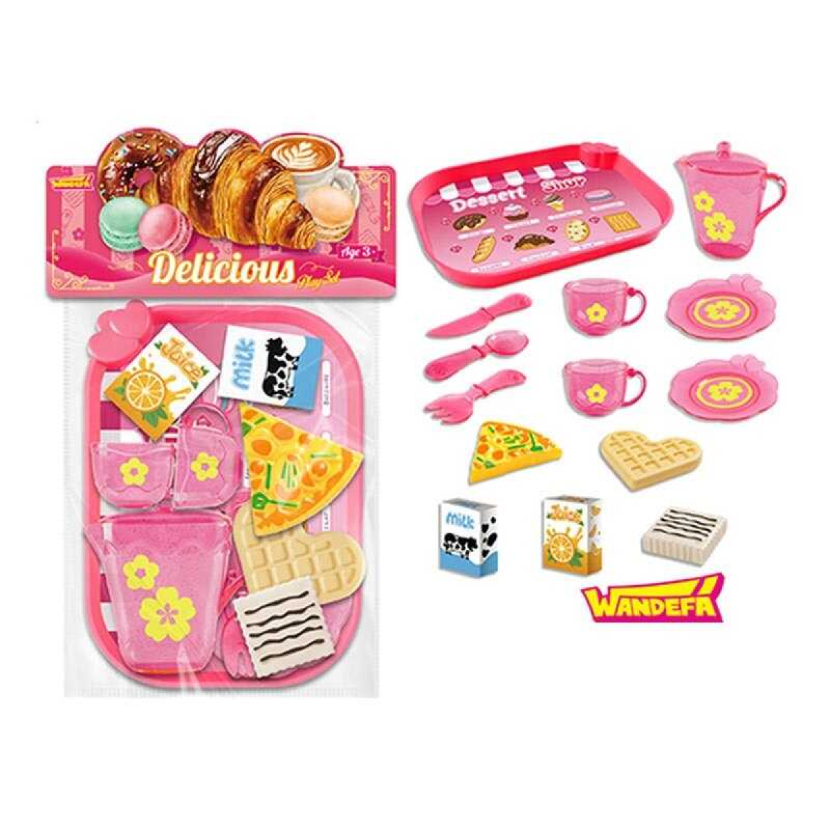 • Набір продуктів 99008 (120/2) таця, 2 чашки, 2 блюдця, чайничок, ніж, ложка, вилка, шматок піци, вафля, коробочки з молоком і соком, в пакеті