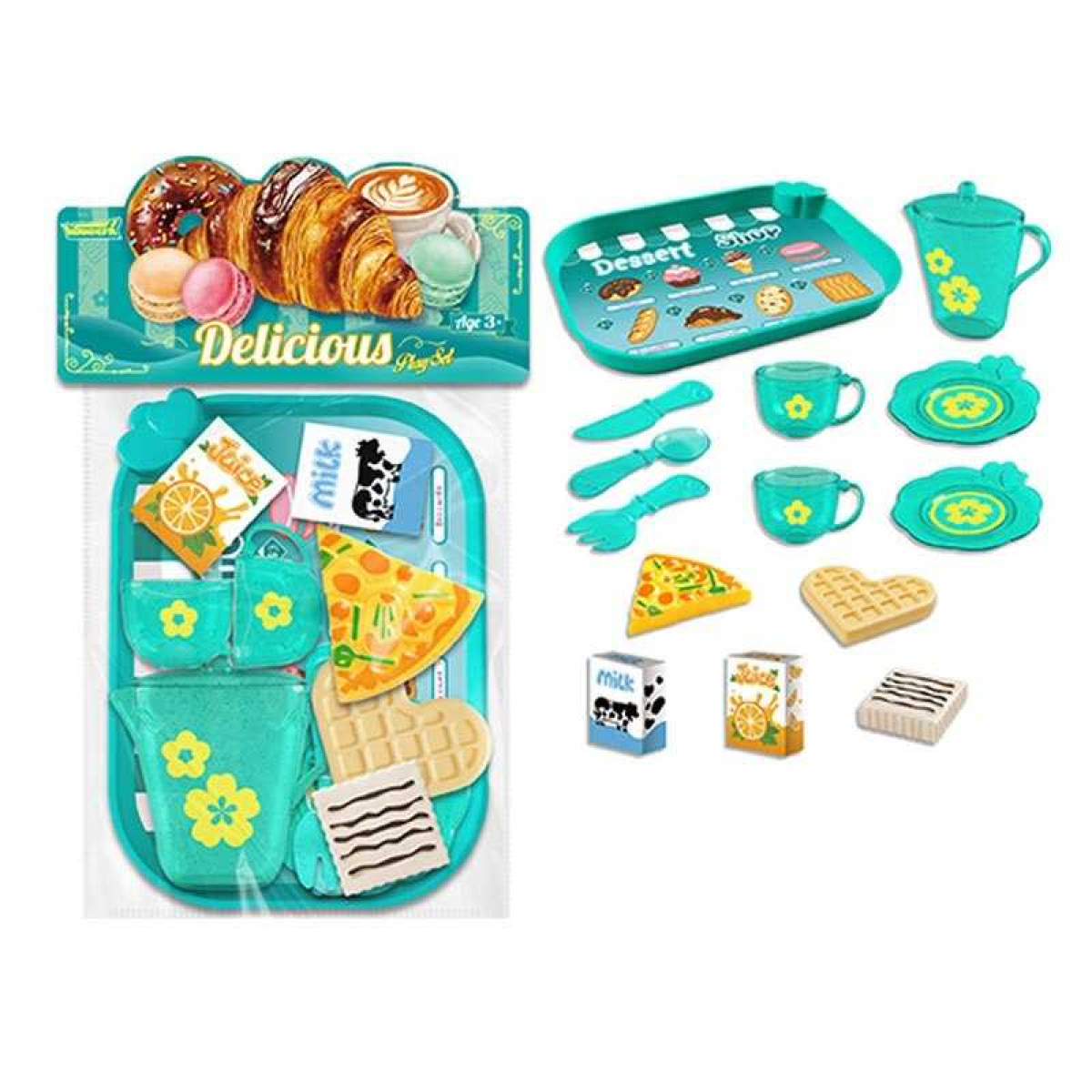 Набір продуктів 99014 (120/2) таця, 2 чашки, 2 блюдця, чайничок, ніж, ложка, вилка, шматок піци, вафля, коробочки з молоком і соком, в пакеті
