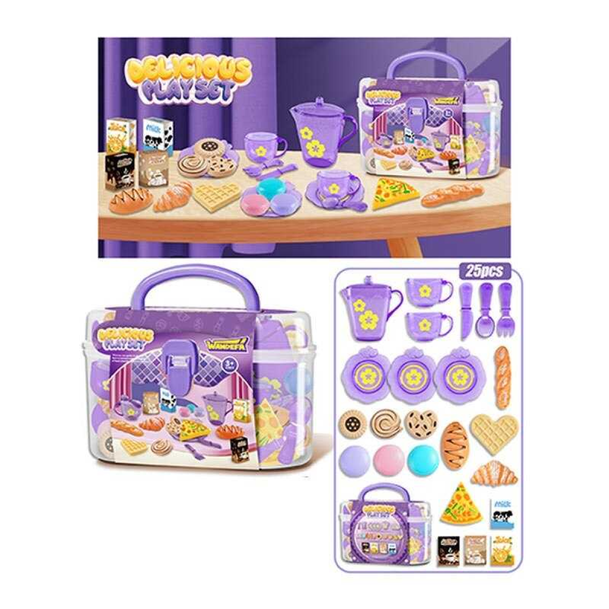 Набір продуктів 99019 (72/2) 25 елементів, 2 чашки, 3 блюдця, чайничок, ніж, ложка, вилка, смаколики, коробочки з напоями, в боксі
