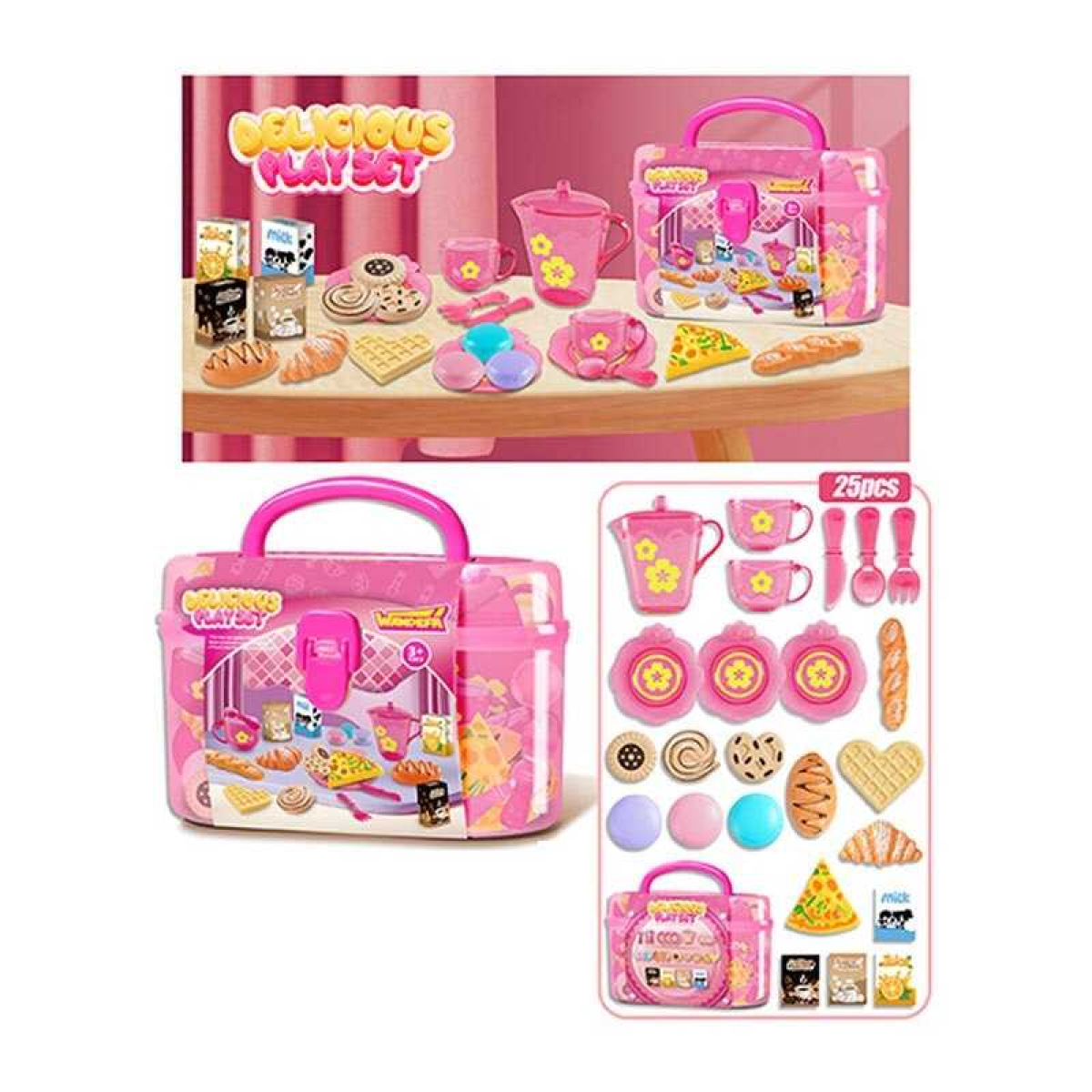 Набір продуктів 99022 (72/2) 25 елементів, 2 чашки, 3 блюдця, чайничок, ніж, ложка, вилка, смаколики, коробочки з напоями, в боксі
