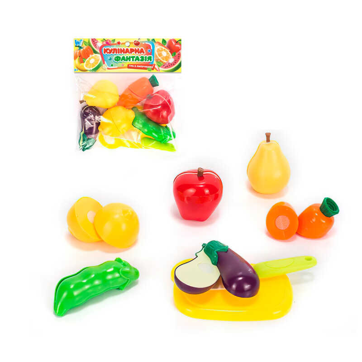 Набір продуктів “Кулінарна фантазія” 556622 (144/2) “WToys“, 14 елементів, овочі та фрукти на липучках, дошка для нарізання, ніж, у пакеті