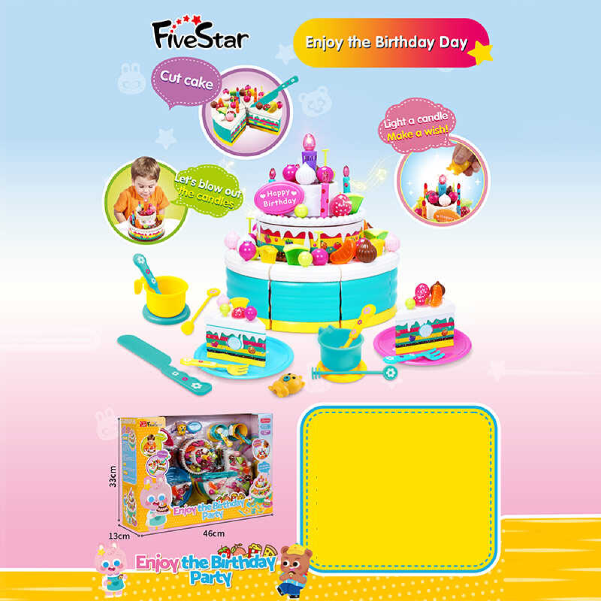 Тортик на липучках 35970 (10/2) смаколики, прикраси, посуд, свічка та запальничка підсвічуються, в коробці