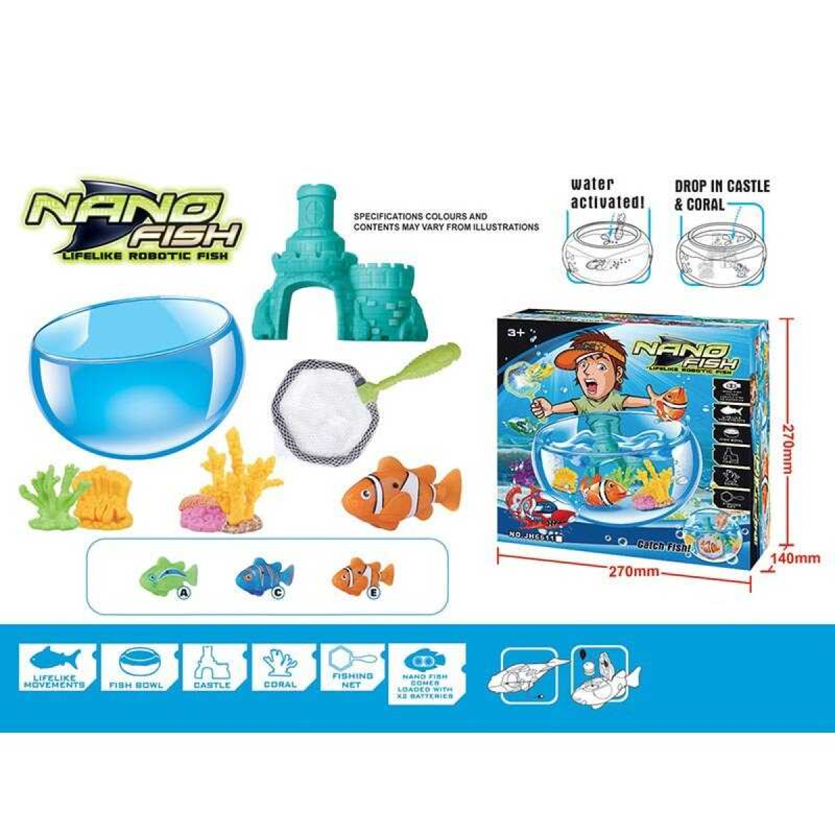 • Акваріум з роборибками JH 6611 E (36/3) 2 штуки, на батарейках, рухають хвостами, гумові корали, замок, сачок, в коробці