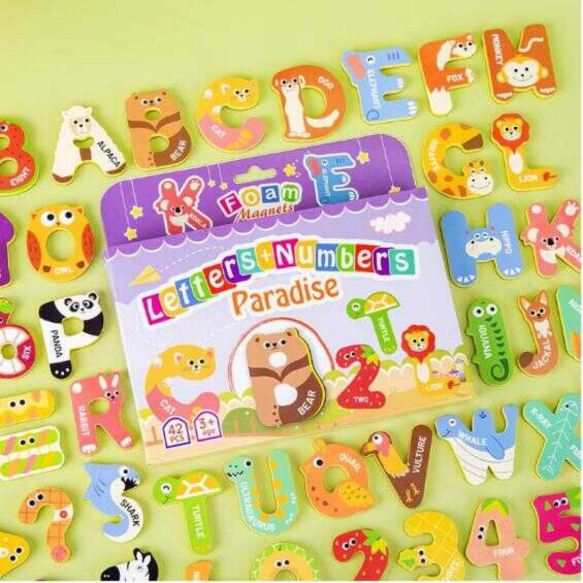 • Магніти M 50542 (68) 42 елементи, англійська абетка, літери, цифри, товщина: 0.5 см, м’які магніти, в коробці