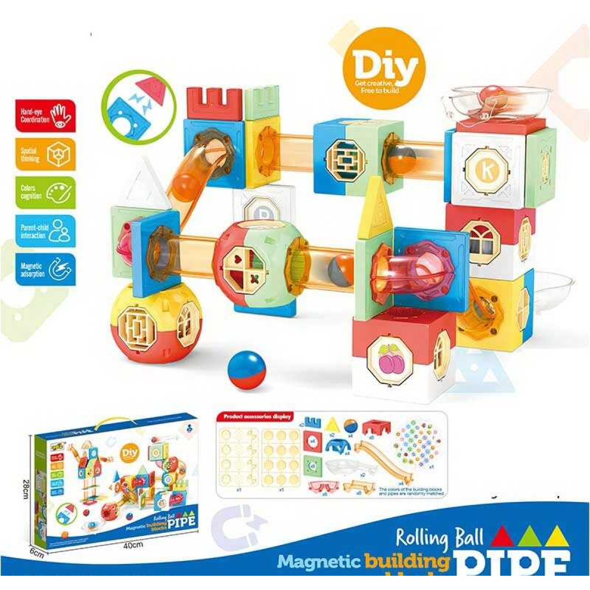 Магнітний конструктор F 0076 (36/2) 79 елементів, кульки, тунелі, наліпки, в коробці