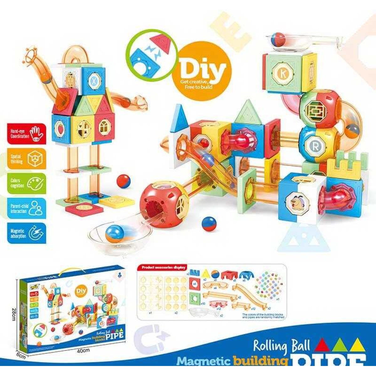 Магнітний конструктор F 0098 (36/2) 111 елементів, кульки, тунелі, наліпки, в коробці