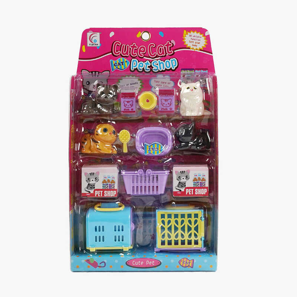 • Набір тварин DW 02 (60/2), 4 фігурки кішок, переноски, кошик, лежанка, щітка для шерсті, мисочка, муляжі їжі, в слюді