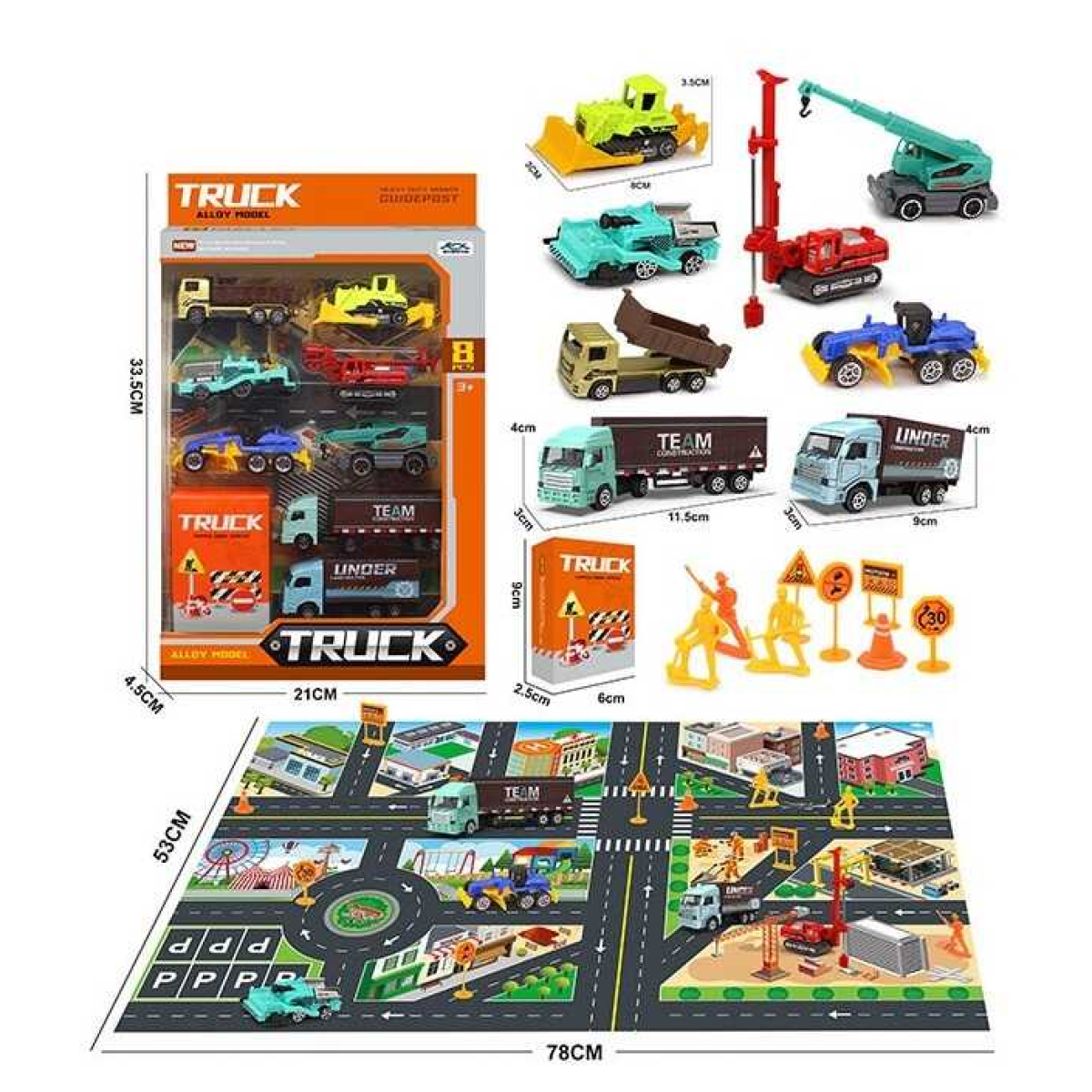 Набір машин KX 09-8 (72/2) металопластик, 8 шт., будівельна техніка, декорації, карта з вулицями, у коробці