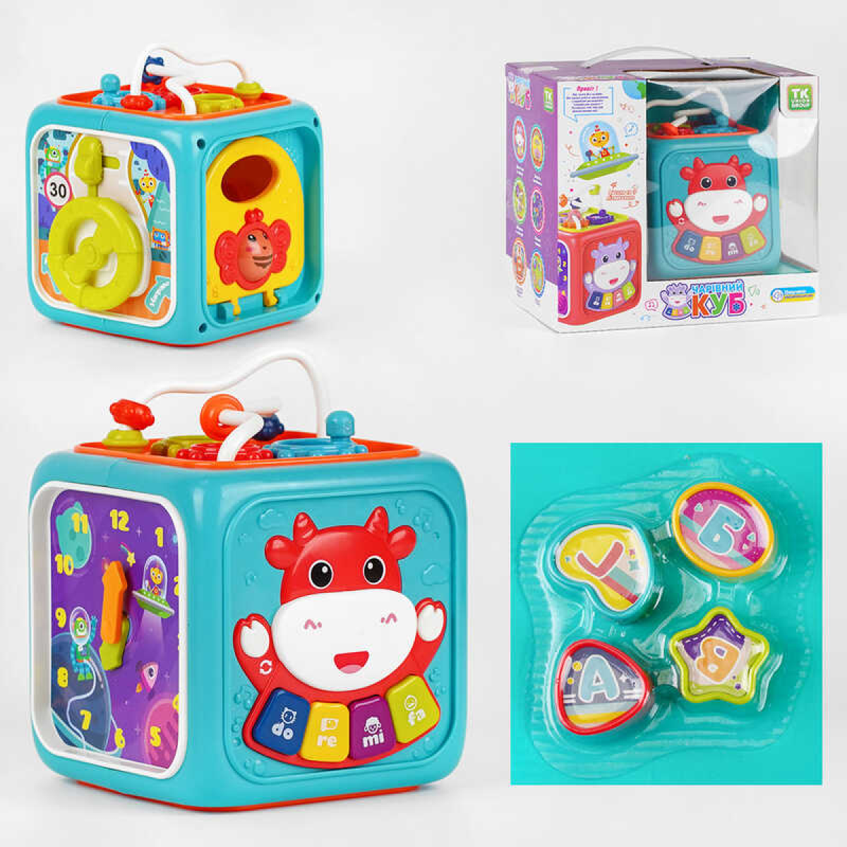 Музичний куб 57959 (24) “TK Group“, ОЗВУЧУВАННЯ УКРАЇНСЬКОЮ МОВОЮ, світло, казки, геометричний сортер, годинник, шестерні та лабіринт, в коробці