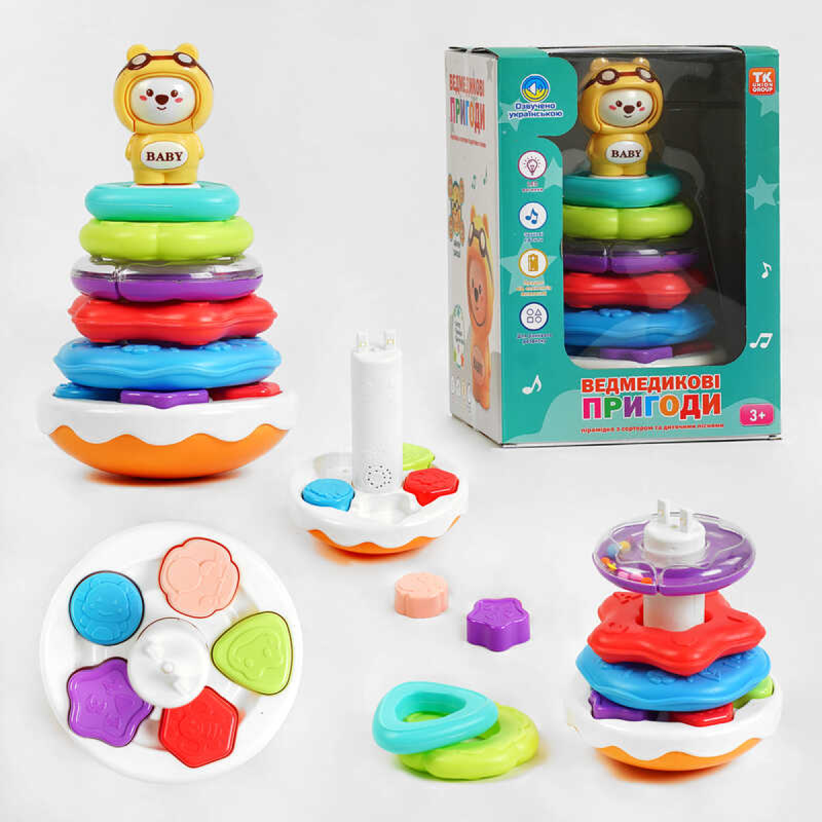 Пірамідка-сортер “Ведмедикові пригоди” ТК - 14074 UK (24) “TK Group“, ОЗВУЧУВАННЯ УКРАЇНСЬКОЮ МОВОЮ, мелодії, 3 пісні, нелягайко, фігурка ведмедика змінює емоції, в коробці