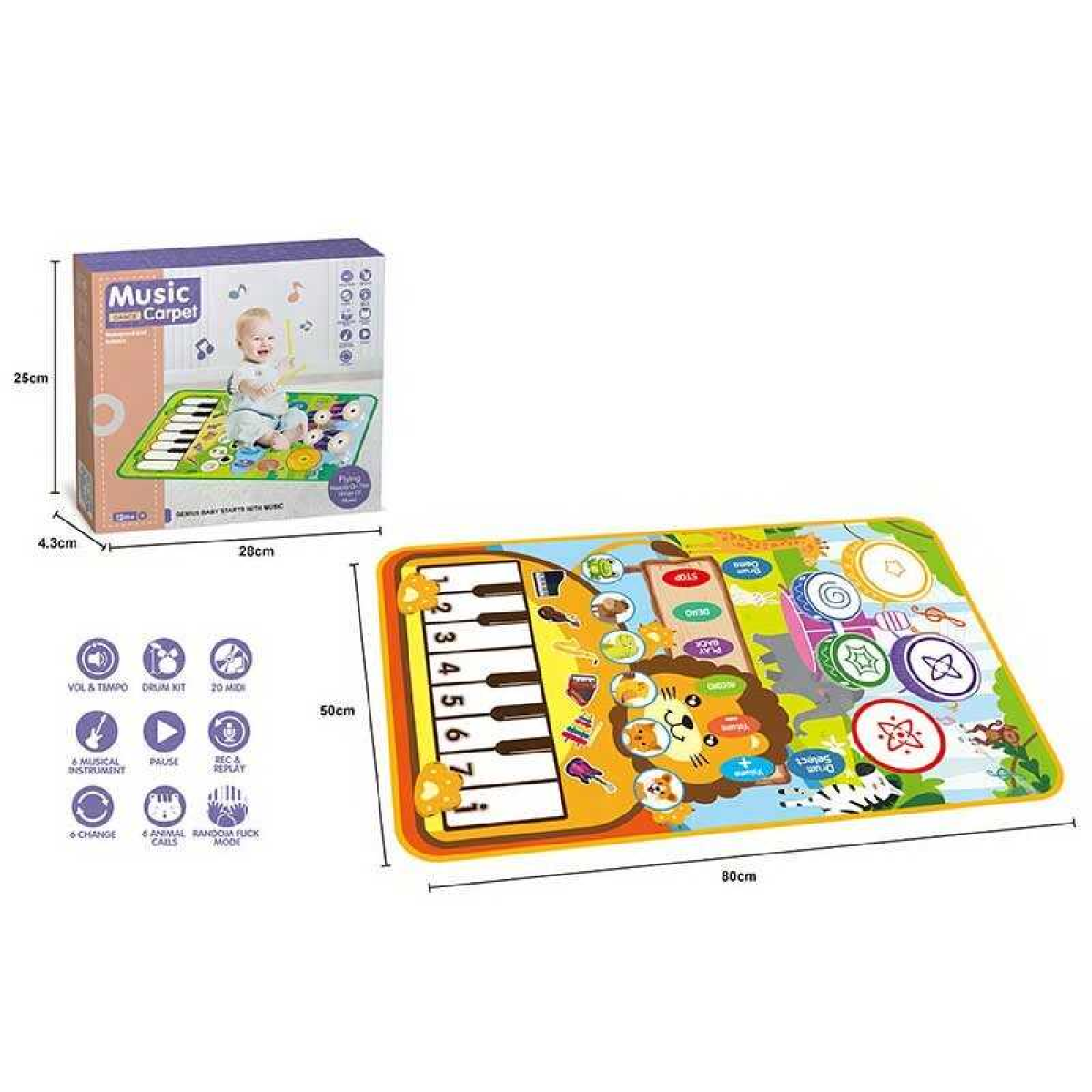 Музичний килимок MTK 035-1 A (72/2) на батарейках, музика, звук, музичні інструменти, запис, режим гучності, барабанні палички, розмір 80х50 см, в коробці