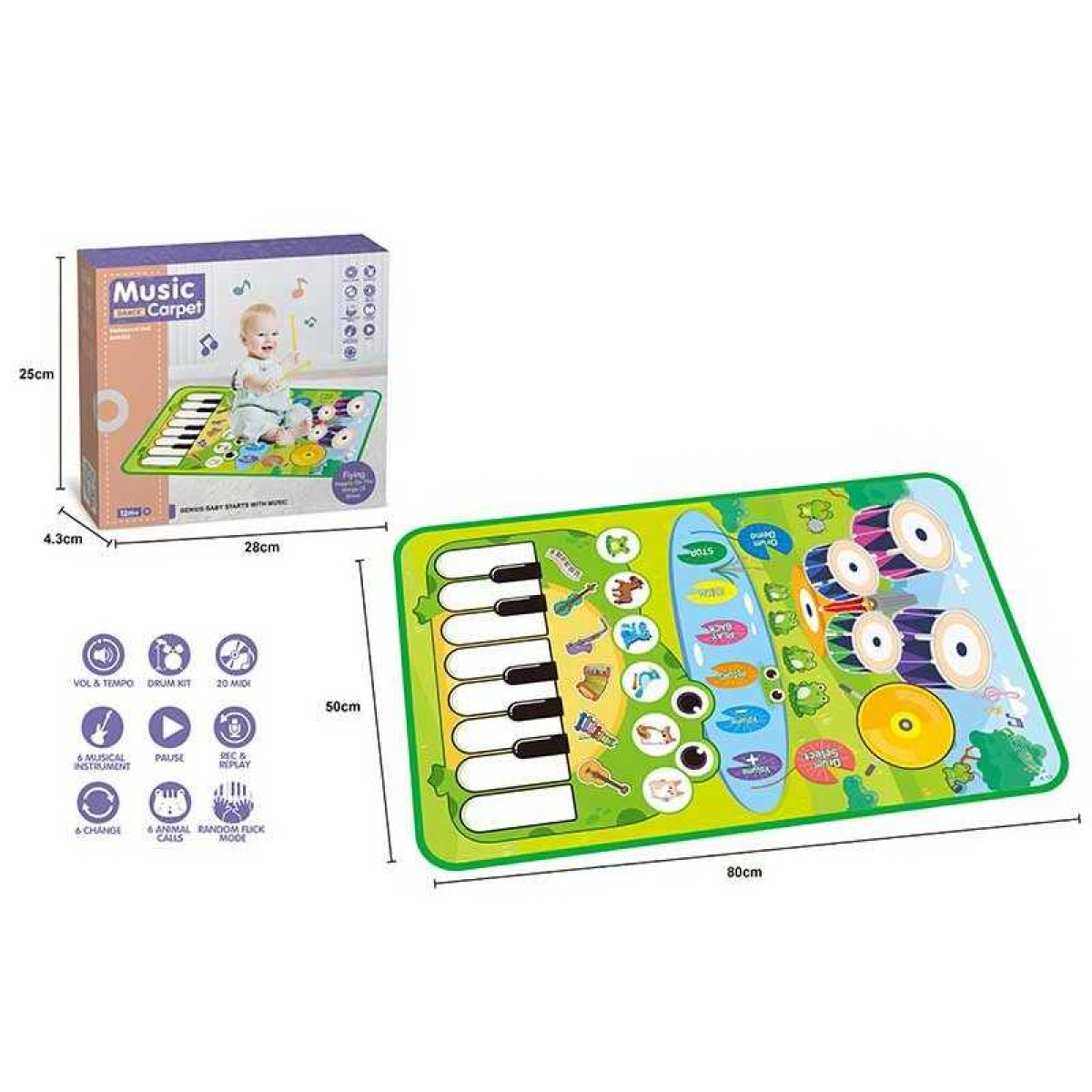 Музичний килимок MTK 035-2 A (72/2) на батарейках, музика, звук, музичні інструменти, запис, режим гучності, барабанні палички, розмір 80х50 см, в коробці