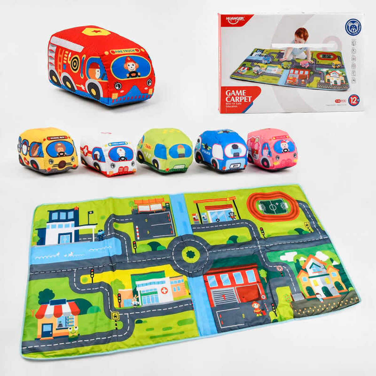 Набір тканинних машин з килимком HE 0243 (12) 6 м“яких машинок з пискавкою, гримлячими, шелесткими елементами, в коробці