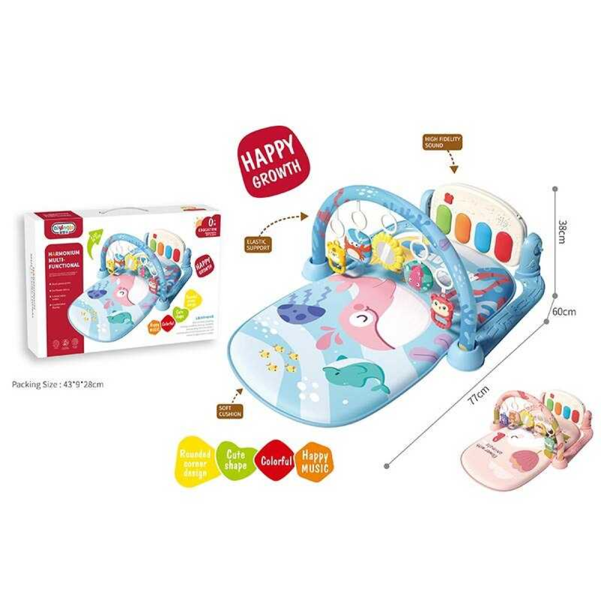 Килимок 668-220 (24) 2 кольори, 5 підвісок, на батарейках, підсвічування, мелодії, зміна режимів, піаніно, регулювання гучності, пискавка, люстерко, в коробці