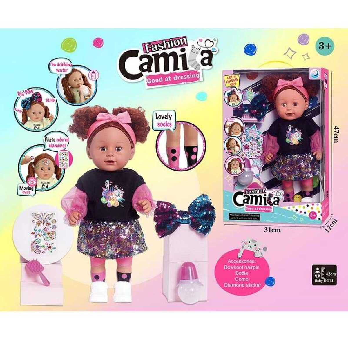 Лялька A 767 B (16/2) висота 42см, п’є, ходить на горщик, заплющує очі, пляшечка, стрази, щітка для волосся, заколка-бантик, в коробці