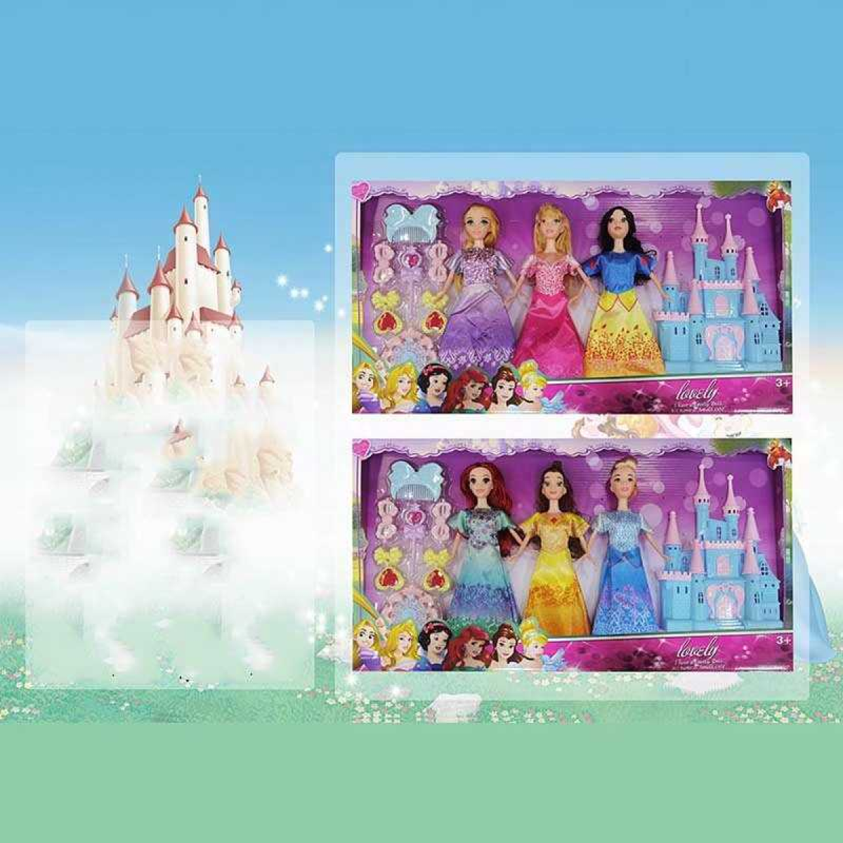 • Набір ляльок K 016 B-1 (36/2) 3 ляльки, принцеси, знімний одяг, аксесуари, замок, висота 28 см, в коробці