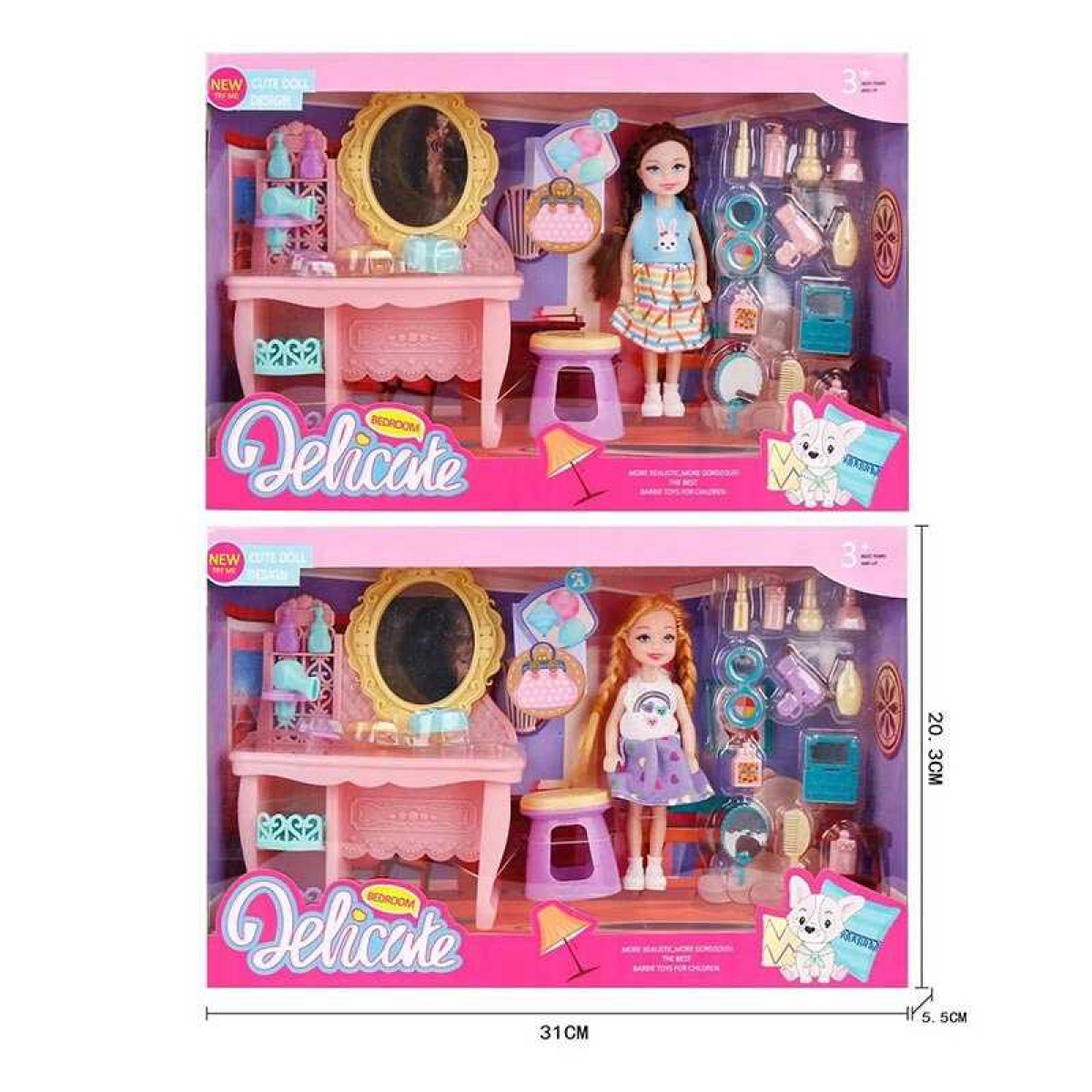 Лялька L 5-36 (96/2) 2 види, трюмо з дзеркалом, стільчик, палетка, парфуми, висота ляльки 14см, в коробці
