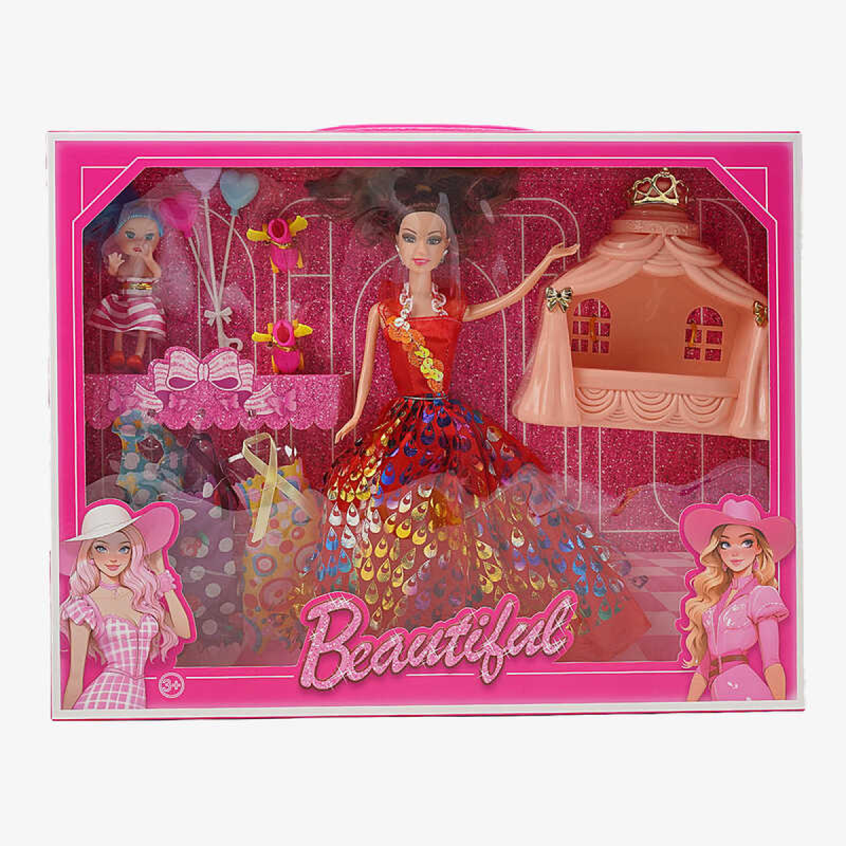 • Набір ляльок 8022 D (36/2) 2 штуки, висота більшої 27см, гумові голови, рухливі кінцівки, 3 сукні, ролики, будиночок, в коробці