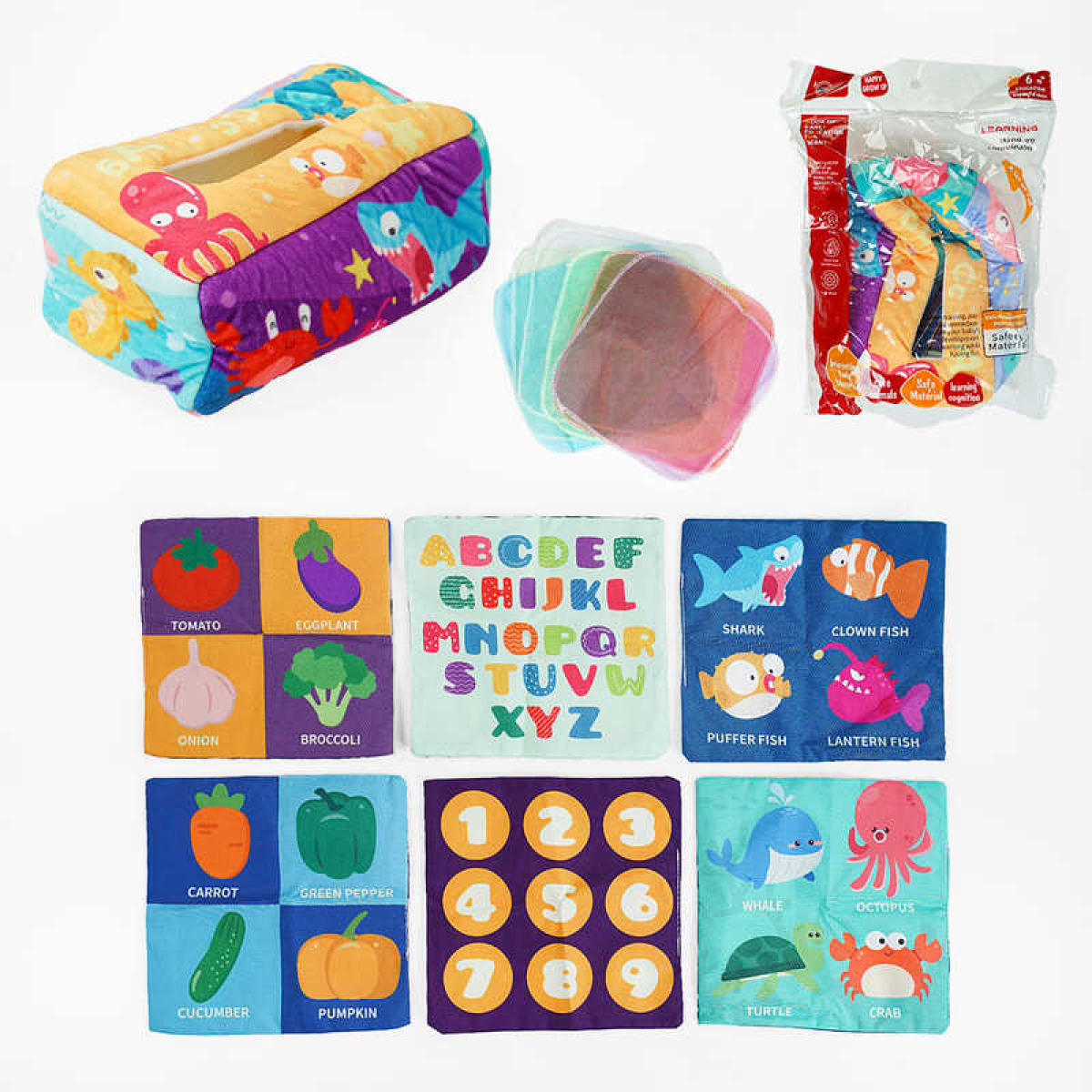 Розвивальна гра 368-2 (168) “Серветниця”, текстиль, 6 серветок, риби, овочі, цифри, англійська абетка, шелестючі елементи, англійські назви, в пакеті