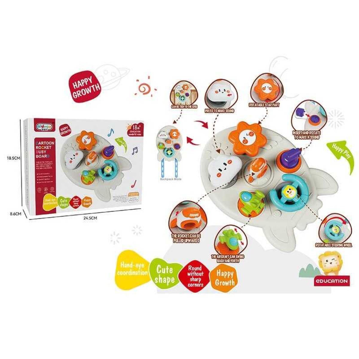 Бізіборд 99-23 (48) “Ракета”, пластикові ремінці, тріскачка, спінер, важіль, 6 забавок, в коробці