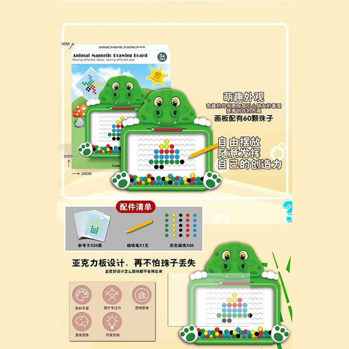 Мозаїка W 6503 (100) магнітна, стилус, кольорові кульки, 10 двосторонніх карток із завданнями, розмір - 25х2.5х32 см, у коробці