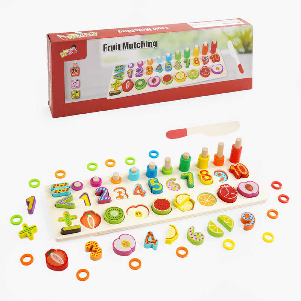 • Логічна дерев’яна дошка C 65785 (40) половинчаті фрукти, кілочки з кільцями, сортер, цифри, знаки додавання-віднімання, дорівнює, в коробці
