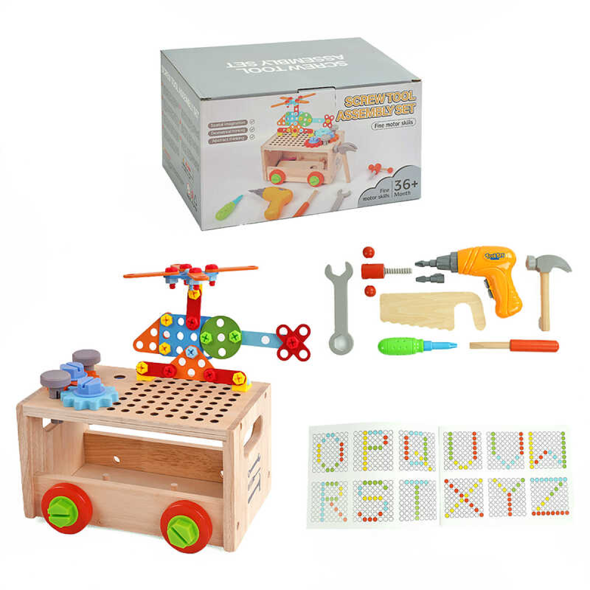 Набір інструментів C 65657 (12) дерев’яний, ящик, столярний верстак, електричний шуруповерт, каталка, конструктор, в коробці
