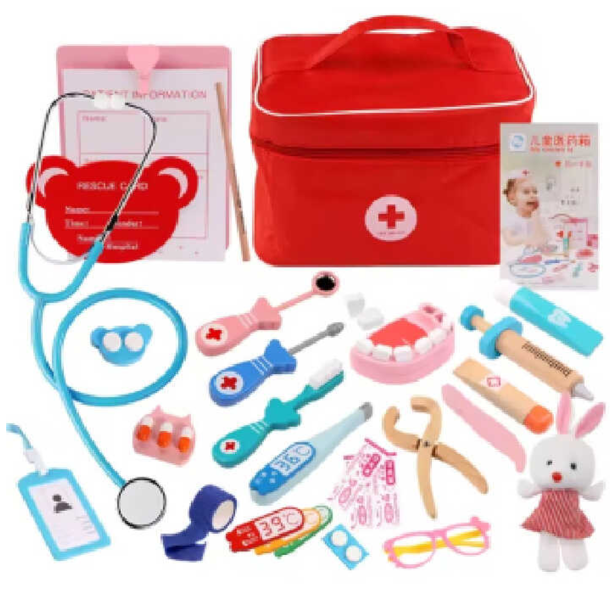 • Набір лікаря C 73289 (32) дерев’яний, м’яка іграшка, стетоскоп, 2 щипців, зубна щелепа, зубна паста, зубна щітка, шприц, термометр, окуляри, пігулки, медичне дзеркало, долото, бинт, пластирі, бейдж, записник з олівцем, магнітні елементи, в сумці