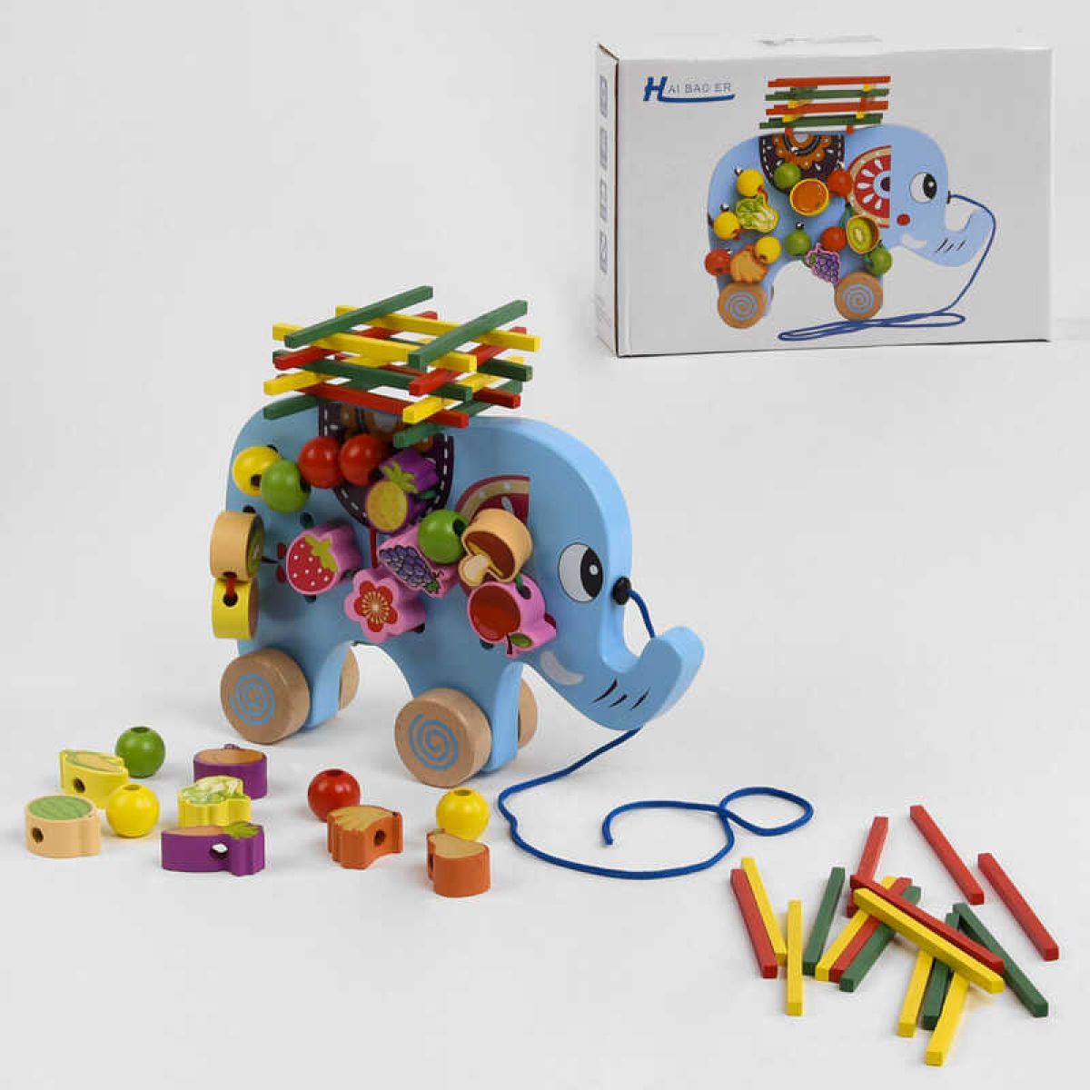 Дерев“яна каталка C 48174 (36) “Слоненя“, шнурівка, брусочки, в коробці