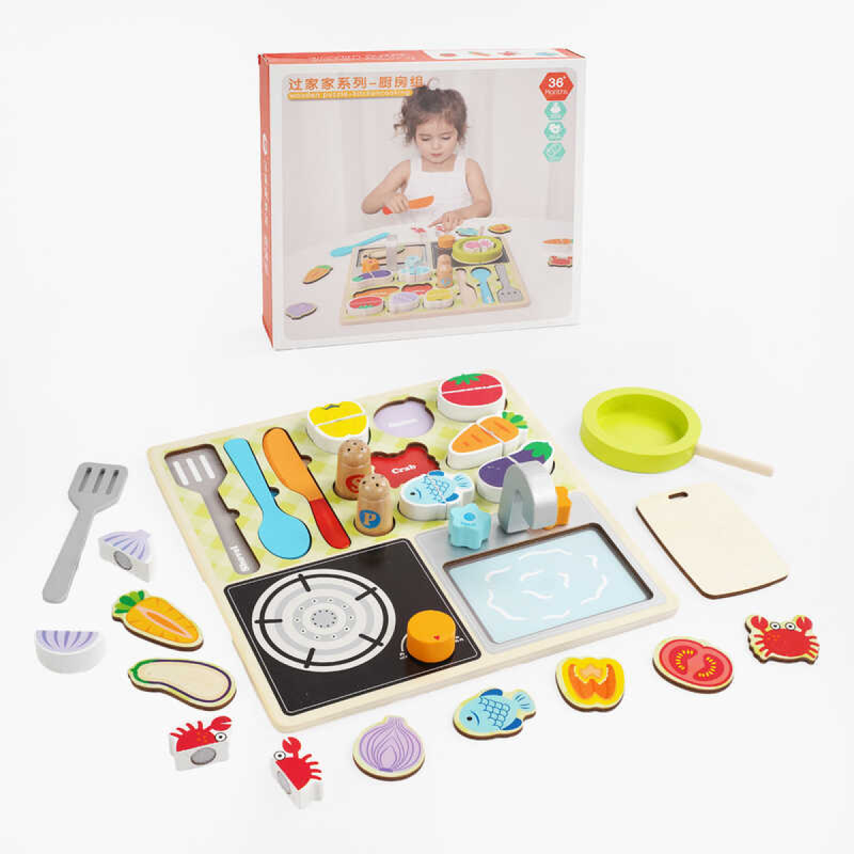 Дерев’яний сортер С 65804 (24) “Кухня”, 22 елементи, набір продуктів, елементи на липучках, безпечний ніж, дошка для нарізання, в коробці