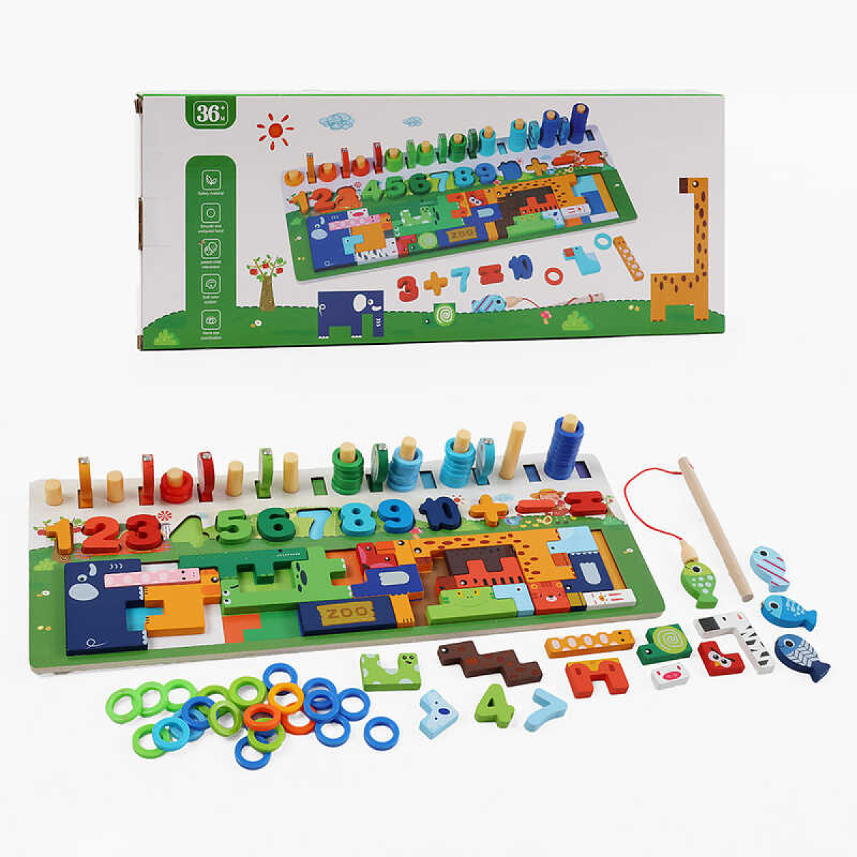 Дошка логічна C 73233 (36) магнітна риболовля, дерев’яна, цифри, сортер, пазл, тваринки, кілочки, кольорові кільця, в коробці