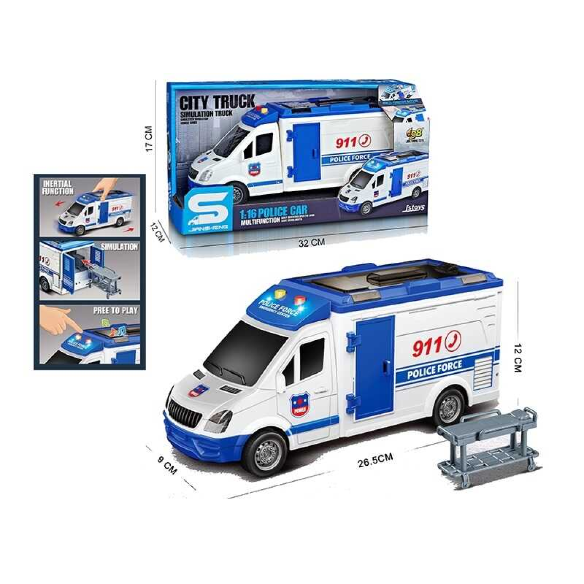 • Машина JS 126 A (36) “Поліція”, масштаб 1:16, тематичні сигнали, підсвічування, інерція, відкривається дах та двері, в коробці