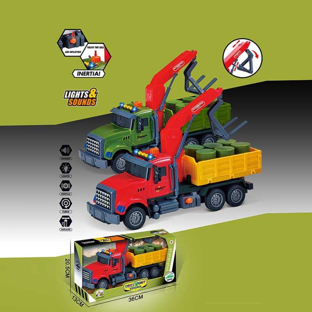 • Машина музична 687-48 B (24/2) 2 кольори, “Вантажівка“, підсвічування, звукові ефекти, механічне підіймання стріли, інерція, рухомі деталі, бочки, в коробці, ВИДАЄТЬСЯ МІКС ВИДІВ