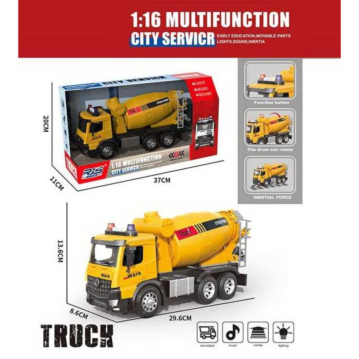 • Спецтехніка GX 02 B (24) бетонозмішувач, масштаб 1:16, світло, звук, інерція, механічний обертовий барабан, гумові шини, в коробці