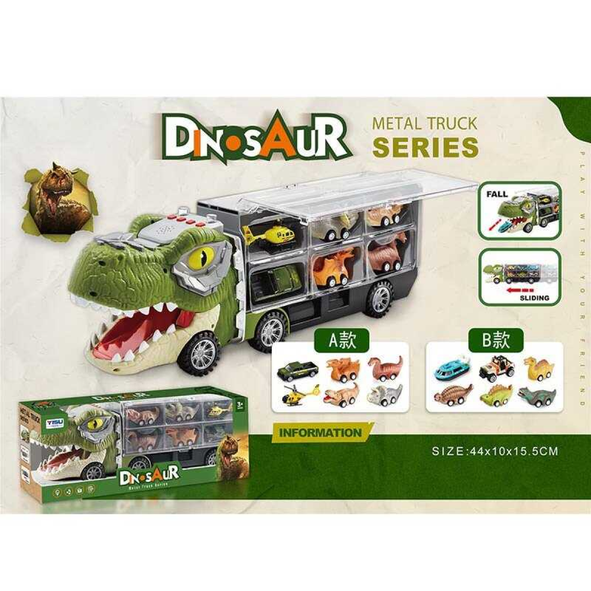 Трейлер 068-190 (12) 43х10х15 см, “Дино-трак”, підсвічування, звук, на батарейках, міні-моделі, причеп прозорий, 12 відділень, в коробці
