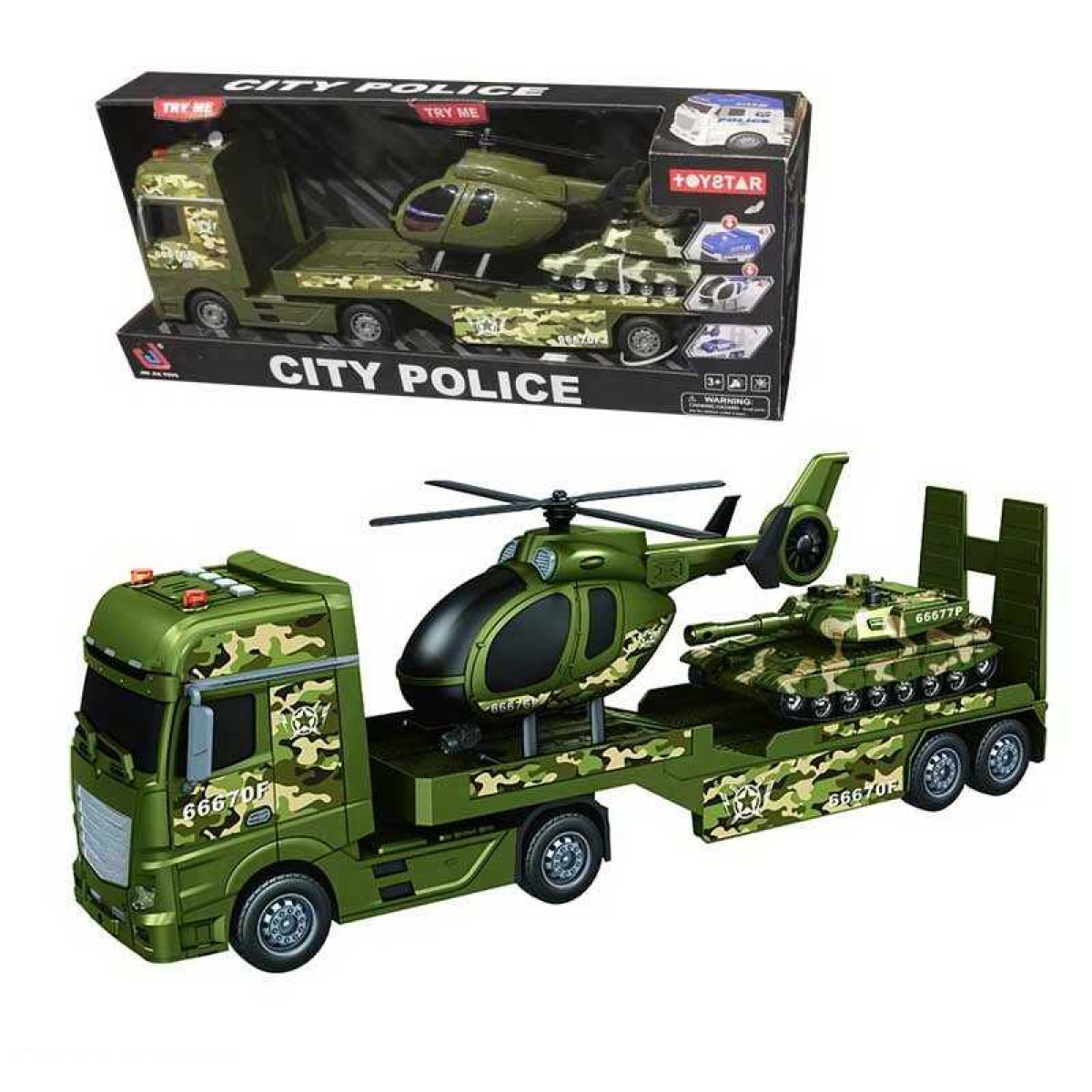 • Трейлер 666-70 F (9) “Військова машина”, звуки, підсвічування, інерція, гумові шини, машинка, гвинтокрил, в коробці