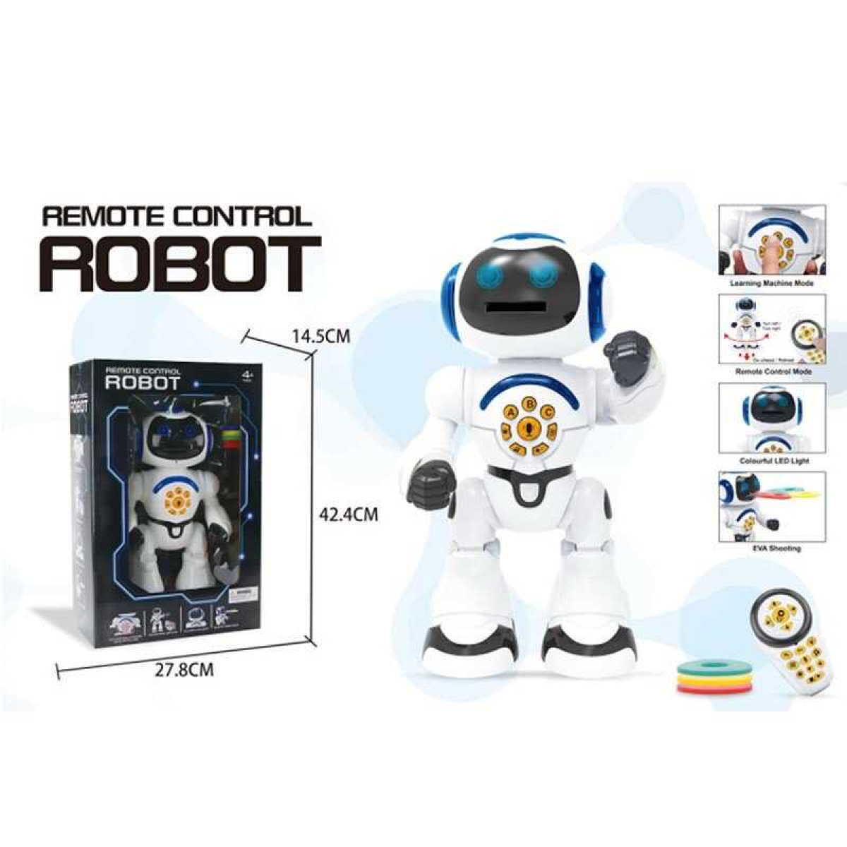 Робот на радіокеруванні J 1052 A (4) звуки, музика, підсвічування, озвучування англ. мовою, стріляє дисками, 9 дисків, на батарейках, історії, вікторина, регулювання гучності, програмування дій, запис голосу, в коробці