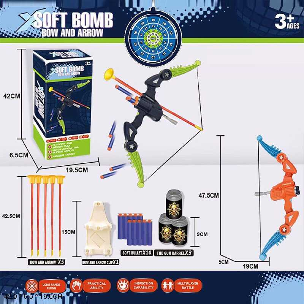 • Лук 316 (48/2) стріляє стрілами з присосками та м’якими патронами, 5 стріл, 10 патронів, мішені, тримач для стріл, в коробці