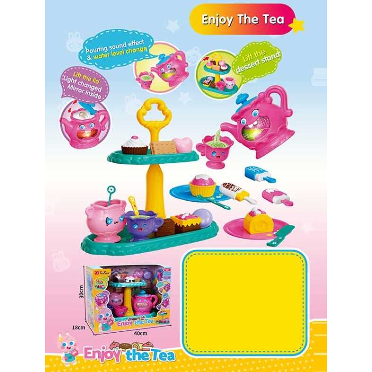 Набір посуду 35639 (8/2) музичний чайник, кольорове підсвічування, 2 режими роботи, перемикач мелодій, звукові ефекти, люстерко, двоярусне сервірувальне блюдо, посуд, муляжі тістечок, печива, морозива, в коробці