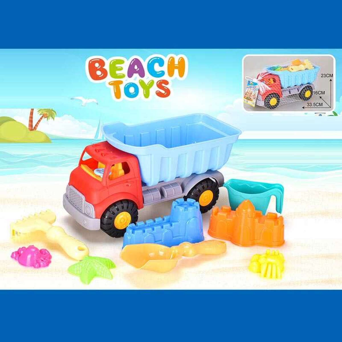 Пісочний набір JX 6854 (36/2) розмір самоскида - 33.5х16х23 см, лопатка, граблі, лійка, 5 формочок, в сітці