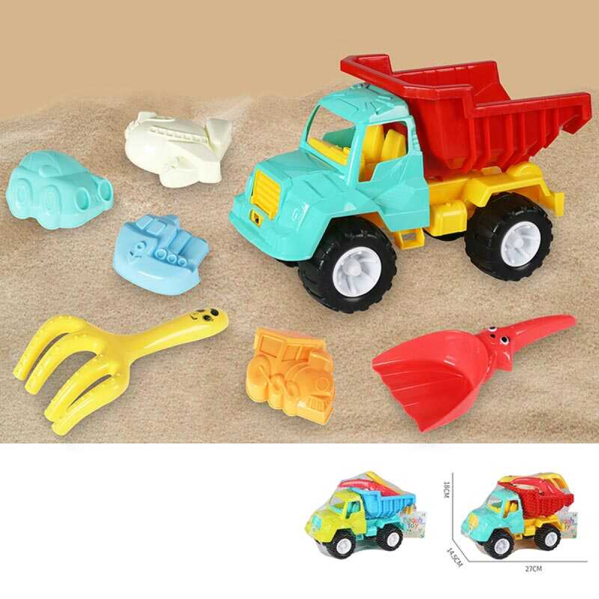 Пісочний набір KZ 6438 (36/2) 2 кольори, розмір самоскида - 27х14.5х18 см, лопатка, граблі, 4 формочки, в сітці