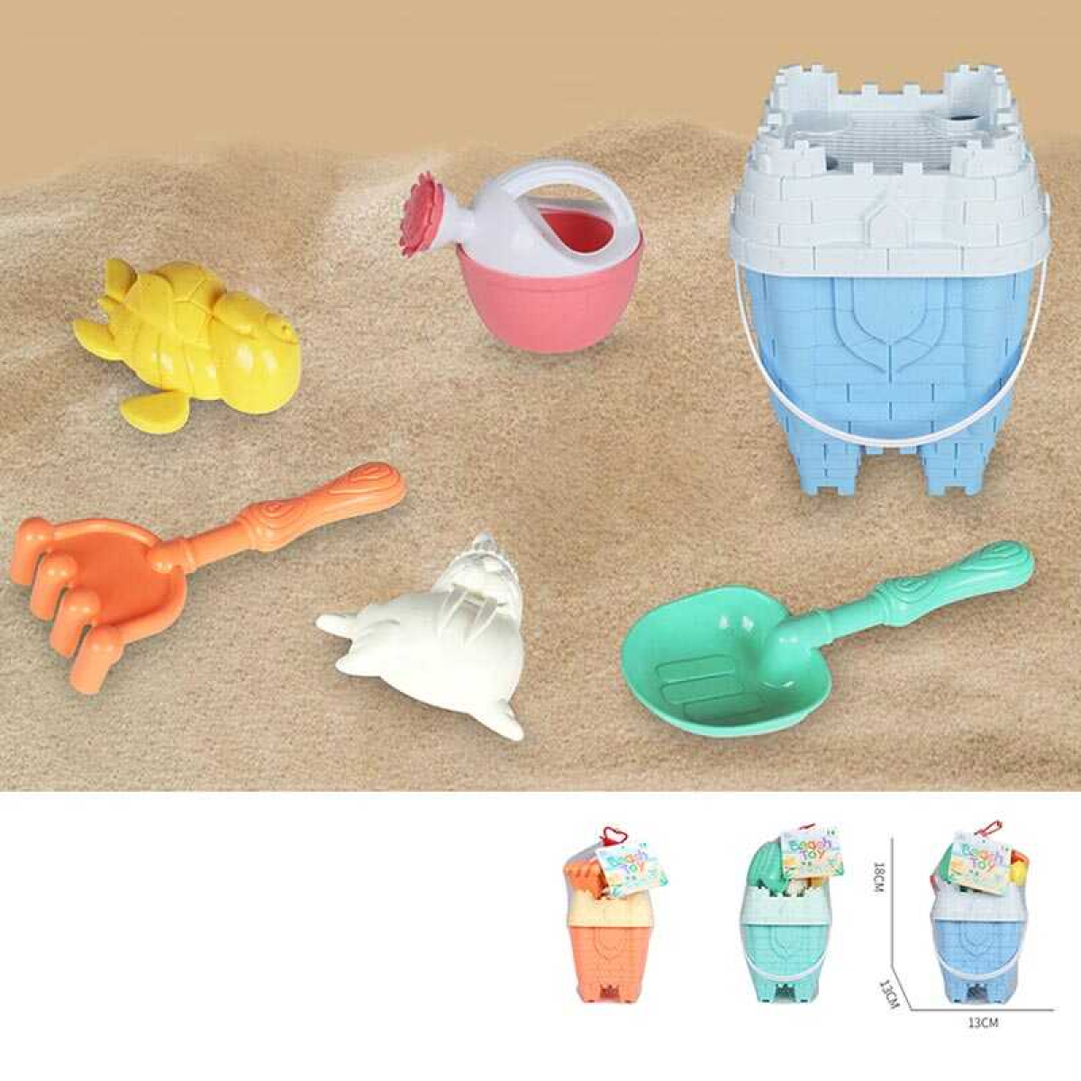 Пісочний набір KZ 6444 A (72/2) 3 кольори, відро, лійка, лопатка, граблі, сито, 2 формочки, в сітці, ВИДАЄТЬСЯ ТІЛЬКИ МІКС ВИДІВ