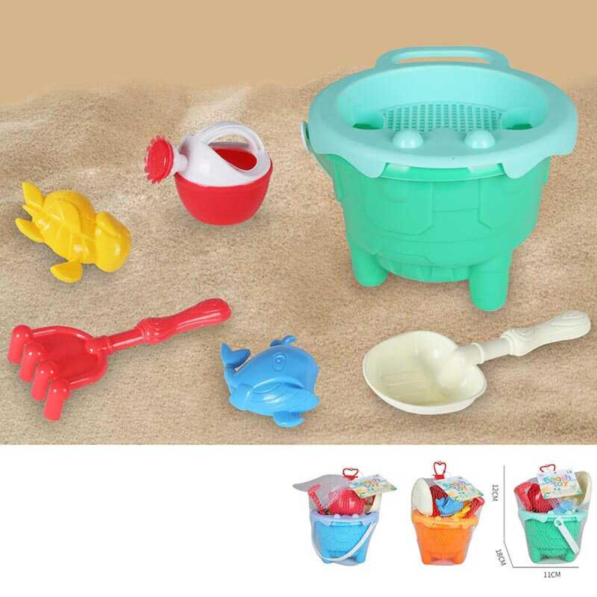 Пісочний набір KZ 6449 (72/2) 3 кольори, відро, лійка, лопатка, граблі, сито, 2 формочки, в сітці, ВИДАЄТЬСЯ ТІЛЬКИ МІКС ВИДІВ