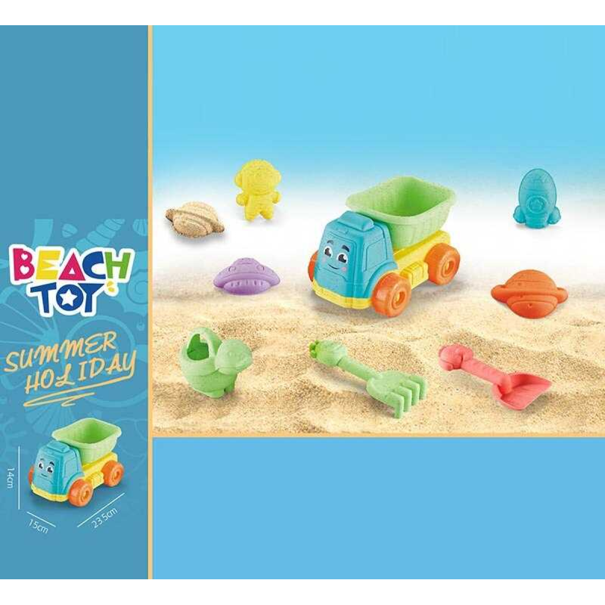 Пісочний набір RMT 366-5 (72) розмір самоскида - 21х15х12.5, лійка, граблі, лопатка, 4 формочки, в сітці