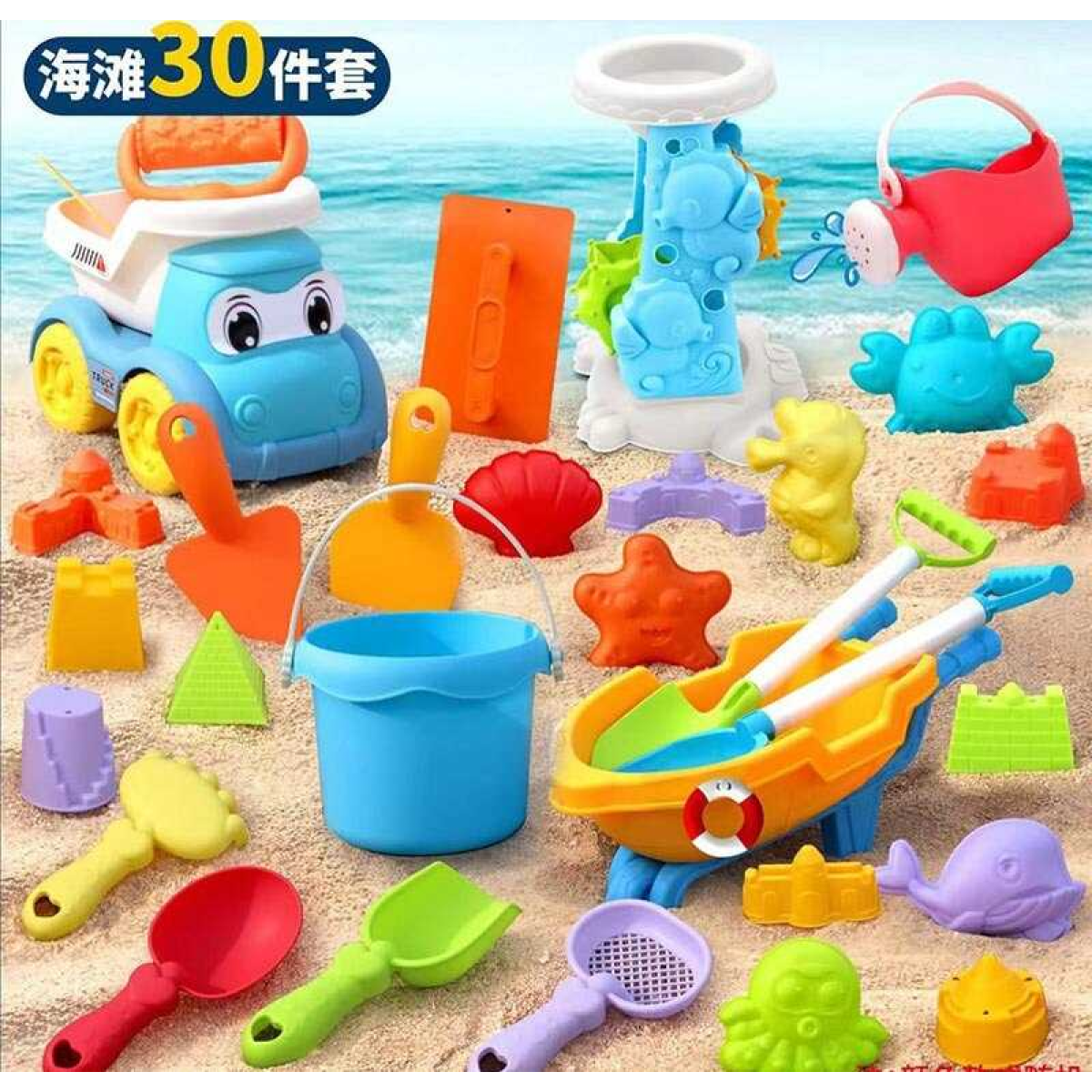 Пісочний набір W 218-47 (36/2) розмір тачки - 27х13х11 см, розмір самоскида - 16.5х11х13 см, висота відра - 9 см, граблі, лопатки, сито, лійка, млин, валик, шпателі, 15 формочок, в сітці
