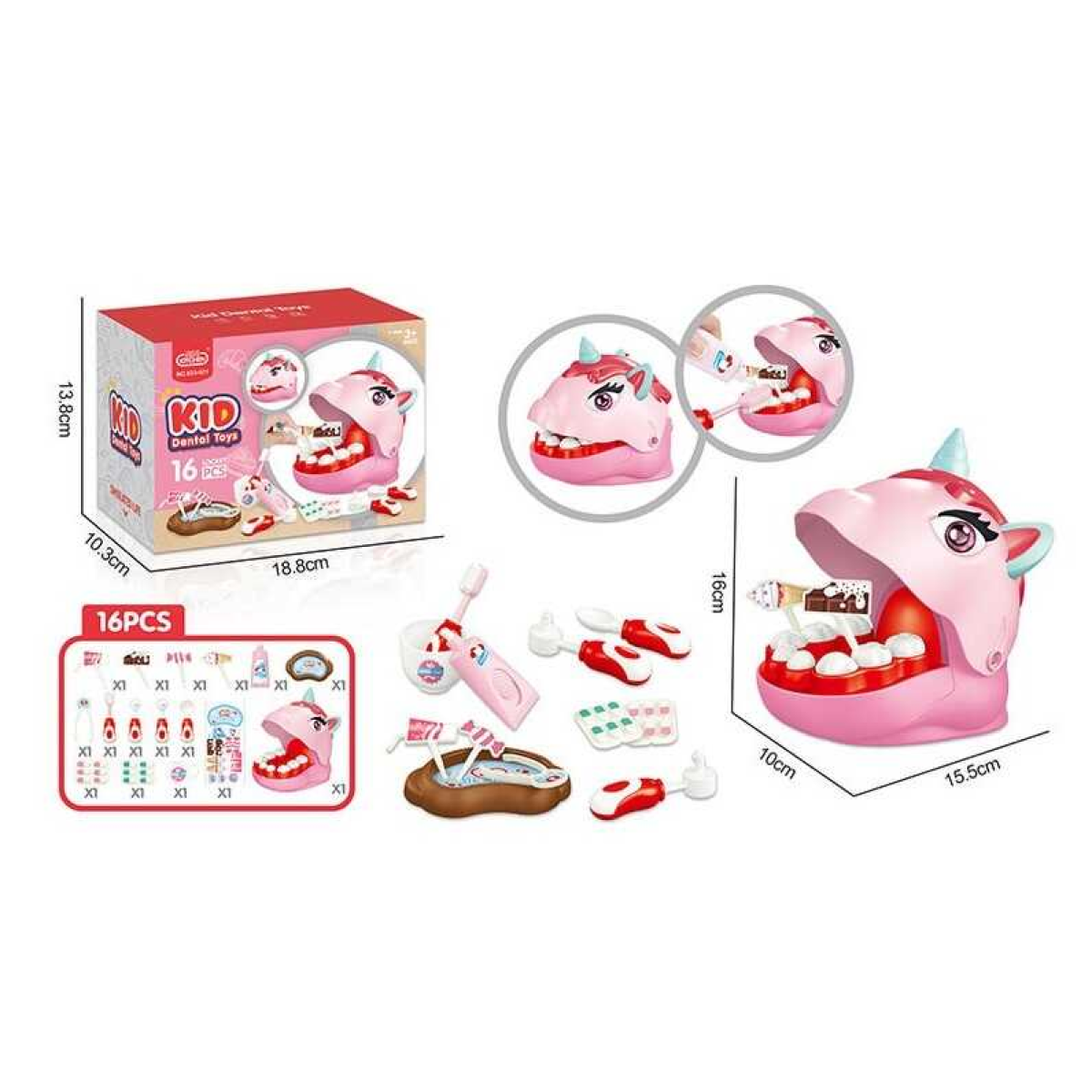 Набір стоматолога 623-921 (72/2) 16 елементів, голова єдинорога, отвори в зубах, інструменти, зубна паста, щітка, щипці, солодощі на паличках, в коробці