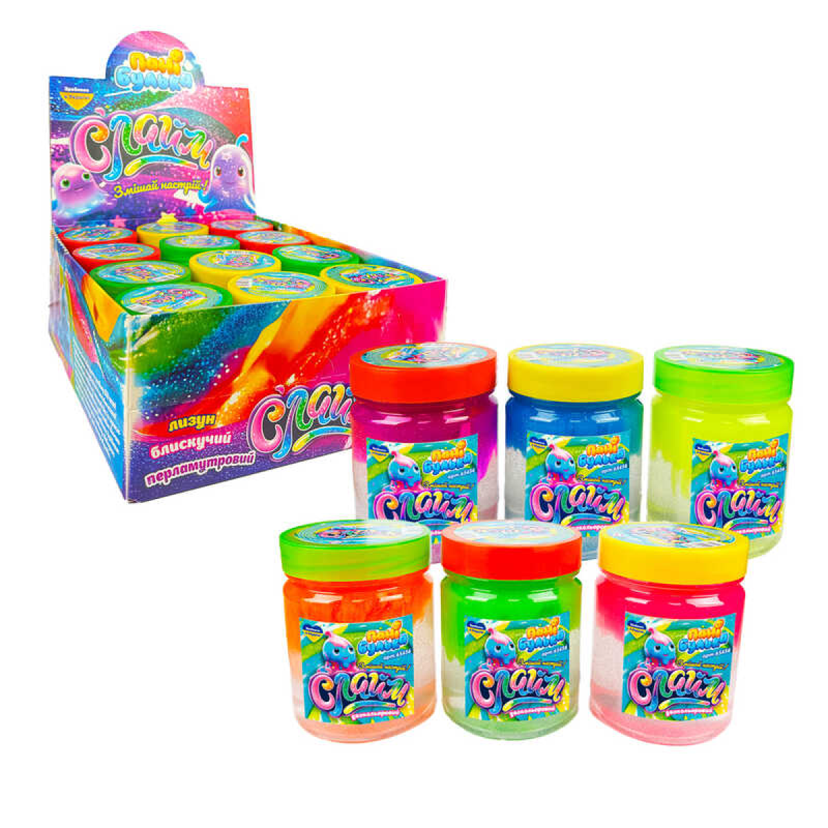 гр Слайм двокольоровий 65456 (1) “Пані Булька“, ЦІНА ЗА 12 ШТУК, велика банка, 200г, ароматизований, 6 кольорів, МІКС
